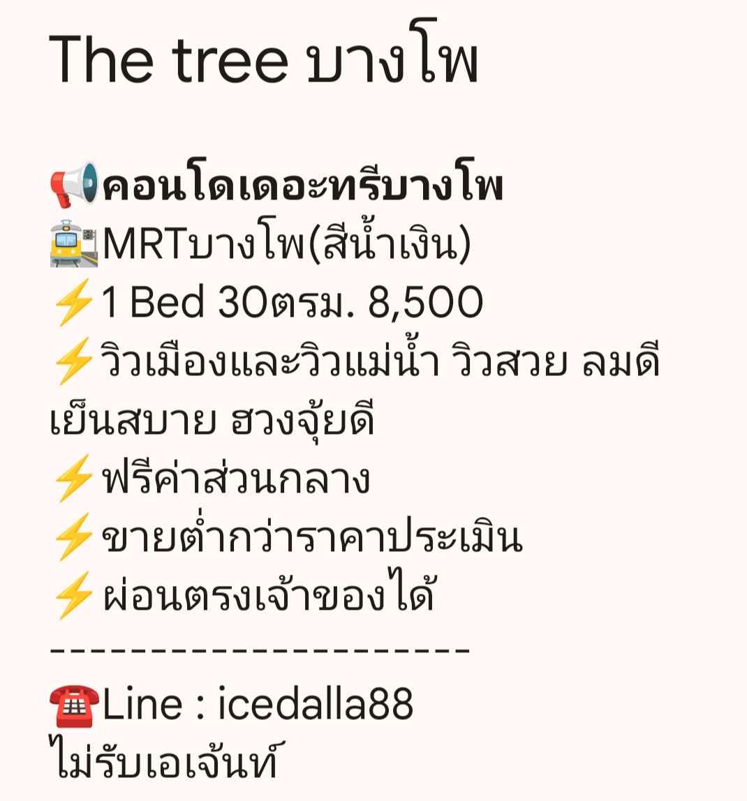คอนโดเดอะทรีบางโพ MRTบางโพสีน้ำเงิน 1 Bed 30ตรม. 8,500 วิวเมืองและวิวแม่น้ำ วิวสวย ลมดี เย็นสบาย ฮวงจุ้ยดี ฟรีค่าส่วนกลาง ขายต่ำกว่าราคาประเมิน ผ่อนตรงเจ้าของได้ --------------------- Line : icedalla88 ไม่รับเอเจ้นท์b THE TREE BANGPHO MRT Bangpho blue line 1 Bed 30 sqm.8,500 River City view Free Facilities ,swimming pool, golf, Garden, Co working space, Yoga, fitness, sky lounge 360, Laundry delivery free ---------------------- สถานที่ตั้ง : ถนนประชาราษฎร์สาย 1 บางซื่อ ฮวงจุ้ยเกรด AAA เดินทางสะดวก : ติดถนนใหญ่ ใกล้รถไฟฟ้า MRT บางโพ เพียง 150 เมตร พื้นที่ส่วนกลาง : วิวโค้งแม่น้ำ -สระว่ายน้ำ เกลือ -ฟิตเนส -ห้องซาวน่า -สวนหย่อม, หลุมพัทกอล์ฟ -Sky lounge -Co working Space -Meeting room ระบบความปลอดภัย : รปภ 24 ชั่วโมง, กล้องวงจรปิดโครงการ, ประตู Key Card สถานที่ใกล้เคียง - ห่างจาก รถไฟฟ้า MRT สถานีบางโพ 150 เมตร - ห่างจากเท่าเรือบางซื่อ - ห่างจาก เซเว่นอีเลฟเว่น 50 เมตร - ห่างจากห้าง Gateway บางซื่อ 200 เมตร ในห้างมี Big C - ห่างจาก รพ.บางโพ 200 เมตร - โลตัสบางซื่อ - รร.โยธินบูรณะ - รร.ราชินีบน - รร.เซนคาเบรียล - ม.พระจอมเกล้าพระนครเหนือ - ทางขึ้นทางด่วนศรีรัช - รถไฟฟ้าสถานีกลางบางซื่อ - โรงพยาบาลยันฮี - โรงพยาบาลเปาโล พหลโยธิน - ที่ตั้งรัฐสภาแห่งใหม่ ประมาณ 1.5 กม. - ซอยอารีย์ ประมาณ 3 กม. - บางลำภู ประมาณ 3.5 กม. - สวนจตุจักร ประมาณ 2.5 กม. - The Market 150 เมต - โรงพยาบาลบางโพ 300 เมตร - ตลาดเตาปูน 800 เมตร - Tesco Lotus บางซื่อ 1.1 กิโลเมตร - สถานีตำรวจนครบาลบางโพ 1.1 กิโลเมตร - SCG สำนักงานใหญ่ 1.4 กิโลเมตร - สำนักงานเขตบางซื่อ 1 กิโลเมตร - โรงเรียนโยธินบูรณะ 1 กิโลเมตร - โรงเรียนสามเสน 2 กิโลเมตร - มหาวิทยาลัยเทคโนโลยีพระจอมเกล้าพระนครเหนือ 3 กิโลเมตร - ตลาดอตก. 3 กิโลเมตร - BigC วงศ์สว่าง 3.5 กิโลเมตร - โรงเรียนสามเสนวิทยาลัย 4 กิโลเมตร - ตลาดนัดสวนจตุจักร, สวนจตุจักร 4 กิโลเมตร - สถานีขนส่งหมอชิต 2 5.4 กิโลเมตร - ตลาดบองมาเช่ 6.1 กิโลเมตร - Central ลาดพร้าว 6.4 กิโลเมตร - The Mall งามวงศ์วาน 7 กิโลเมตร ------------------------- สนใจติดต่อ : ปอ Line : icedalla88 ไม่รับเอเจ้นท์ ฿8,500 กรุงเทพมหานคร, ประเทศไทย