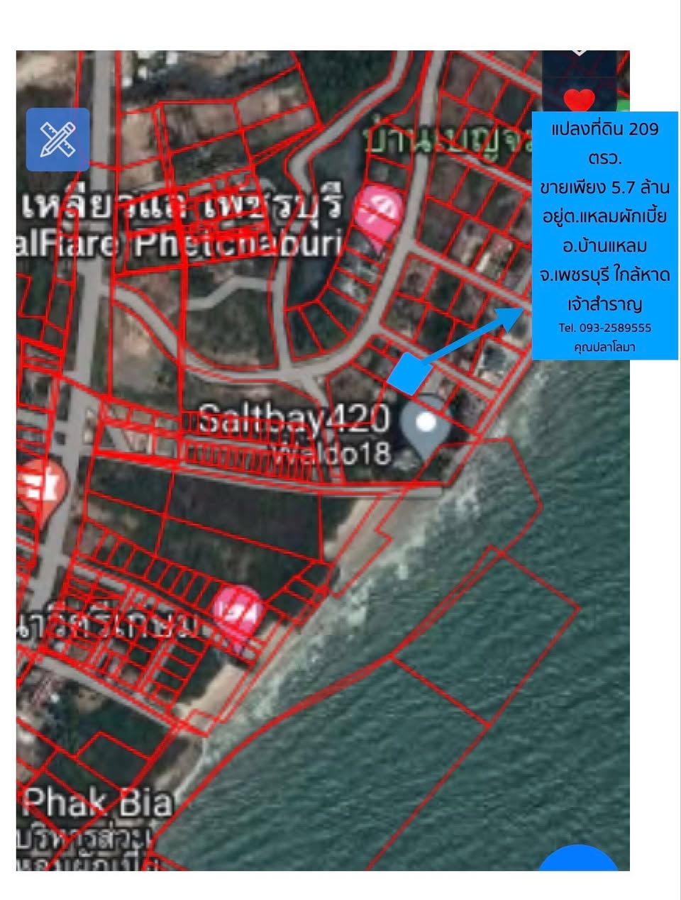ขายที่ดินแปลงสวย ใกล้ทะเล ขนาด 209 ตรว. ห่างจากทะเล 40 ม. ติดทะเลสาป เป็นหมู่บ้านริมทะเล ที่ดินหน้ากว้าง 21x20 ม. อยู่ต.แหลมผักเบี้ย อ.บ้านแหลม จ.เพชรบุรี ใกล้หาดเจ้าสำราญ ห่างจากตัวจังหวัดเพชรบุรี 20 กม. ขับรถจากกรุงเทพประมาณ 2 ชม. เท่านั้น อยู่เส้นถนนเลียบชายทะเล ขับรถไปถนนพระรามสองได้เลย จะมีหาดแหลมหลวงอยู่ภายในหมู่บ้าน มีทะเลสาปและป่าชายเลน ใกล้หมู่บ้านชาวประมง มีอาหารทะเลสดๆขายมากมาย ชื่อทรัพย์ : ขายที่ดินเปล่า ประเภททรัพย์ : ขนาด 20x20 เมตร ห่างจากทะเลเพียง 50 เมตร ติดทะเลสาป สถานที่ : ต.แหลมผักเบี้ย อ.บ้านแหลม จ.เพชรบุรี ขนาดที่ดิน : 209 ตรว. ราคา : 5,700,000 บาท ความฝันอยากมีบ้านริมทะเลต้องเป็นจริงให้ได้ โฉนดถูกต้องตามกฎหมายทุกอย่าง ใกล้กรุงเทพ ขับรถประมาณ 2 ชม. การเดินทางสะดวก น้ำ ไฟ อินเตอร์เน็ตพร้อม ใกล้โรงพยาบาล มีรพ.กรุงเทพ ประจำจังหวัดเพชรบุรี ห่างไป 20 กม. ใกล้ตลาด หมู่บ้านชาวประมง อาหารสมบูรณ์ ต้องที่นี่แหลมผักเบี้ย จ.เพชรบุรี ห่างจากทะเลเพียง 50 เมตร ติดทะเลสาป มีถนนเลียบชายทะเลผ่านหน้าหมู่บ้าน เป็นหมู่บ้านริมทะเล ซื้อลงทุนคุ้มค่ามาก เพราะเมื่อถนนพระราม 2 และทางด่วนสร้างเสร็จ ราคาขึ้นอีกเยอะมาก ราคาจับต้องได้เพียง 5.7 ล้าน ราคาดีงามมาก ลดราคาพิเศษช่วงเศรษฐกิจไม่ดี ชอบจริง ราคาคุยกันได้ พร้อมโอนคะ ยินดีรับเอเจนต์คะ ติดต่อคุณเก๋ เจ้าของขายเอง Line OA : @RealRareProperties Beautiful seaside land for sale in Phetchaburi. 209 sq.wah, only 4050 m from the beach, lakeside, ready to transfer. Great for a seaside home or investment. Land for Sale Near the Sea, Phetchaburi Beautiful vacant land close to the sea, 209 sq.wah , only 40 meters from the beach , adjacent to a lake , located in a seaside village . The land has a wide frontage of approximately 21 x 20 meters and is situated in Laem Phak Bia Subdistrict, Ban Laem District, Phetchaburi Province , near Chao Samran Beach . Approximately 20 km from Phetchaburi city About 2 hours drive from Bangkok Located along the coastal road , with convenient access to Rama II Road Within the village, there is Laem Luang Beach , a lake , and mangrove forest . Close to a local fishing community with abundant fresh seafood available daily . Property Details Property Name: Vacant Land for Sale Property Type: Vacant land, approx. 20 x 20 m , only 50 m from the sea , lakeside Location: Laem Phak Bia Subdistrict, Ban Laem District, Phetchaburi Province Land Size: 209 sq.wah Price: THB 5,700,000 Key Highlights Your dream of owning a seaside home can come true Title deed fully legal and ready for transfer Close to Bangkok, approx. 2 hours drive Easy access with good transportation Utilities available: water, electricity, internet Near hospital Bangkok Hospital Phetchaburi, approx. 20 km Close to local markets and fishing village with excellent food options Only 50 m from the sea , adjacent to a lake Seaside village with a coastal road in front Excellent investment potential land value expected to rise significantly once Rama II Road and expressway projects are completed Attractive price of THB 5.7 million Special price during economic slowdown negotiable for serious buyers Ready to transfer Agents welcome. Contact Khun Kay Owner Direct Sale LINE OA: @RealRareProperties
