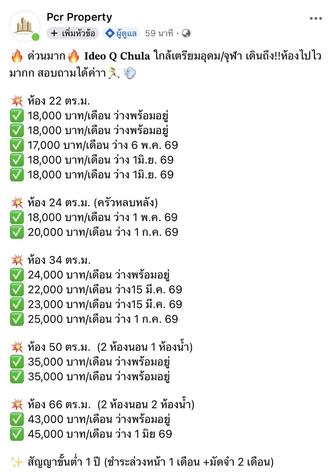 ด่วนมาก 𝐈𝐝𝐞𝐨 𝐐 𝐂𝐡𝐮𝐥𝐚 ใกล้เตรียมอุดม/จุฬา เดินถึง!!ห้องไปไวมากก สอบถามได้ค่าา ห้อง 22 ตร.ม. 18,000 บาท/เดือน ว่างพร้อมอยู่ 18,000 บาท/เดือน ว่างพร้อมอยู่ 17,000 บาท/เดือน ว่าง 6 พ.ค. 69 18,000 บาท/เดือน ว่าง 1มิ.ย. 69 18,000 บาท/เดือน ว่าง 1มิ.ย. 69 ห้อง 24 ตร.ม. ครัวหลบหลัง 18,000 บาท/เดือน ว่าง 1 พ.ค. 69 20,000 บาท/เดือน ว่าง 1 ก.ค. 69 ห้อง 34 ตร.ม. 24,000 บาท/เดือน ว่างพร้อมอยู่ 22,000 บาท/เดือน ว่าง15 มี.ค. 69 23,000 บาท/เดือน ว่าง15 มี.ค. 69 25,000 บาท/เดือน ว่าง 1 ก.ค. 69 ห้อง 50 ตร.ม. 2 ห้องนอน 1 ห้องน้ำ 35,000 บาท/เดือน ว่างพร้อมอยู่ 35,000 บาท/เดือน ว่างพร้อมอยู่ ห้อง 66 ตร.ม. 2 ห้องนอน 2 ห้องน้ำ 43,000 บาท/เดือน ว่างพร้อมอยู่ 45,000 บาท/เดือน ว่าง 1 มิย 69 สัญญาขั้นต่ำ 1 ปี ชำระล่วงหน้า 1 เดือน +มัดจำ 2 เดือน สนใจติดต่อ: โทร: 𝟬𝟵𝟳𝟬𝟭𝟮𝟳𝟵𝟱𝟱 น้องเพชร 𝗟𝗶𝗻𝗲:@602siciw https://lin.ee/uHjIG9X #IdeoQChulaSamyan #ideoqสามย่าน #เช่าคอนโดสามย่าน #คอนโดใกล้จุฬา #คอนโดจุฬา #สามย่านมิตรทาวน์ #MRTสามย่าน